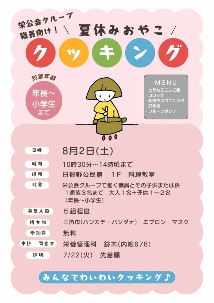 今年も夏休み期間中に、栄公会グループの職員向けに、栄養管理科主催の親子クッキング教室を行います!