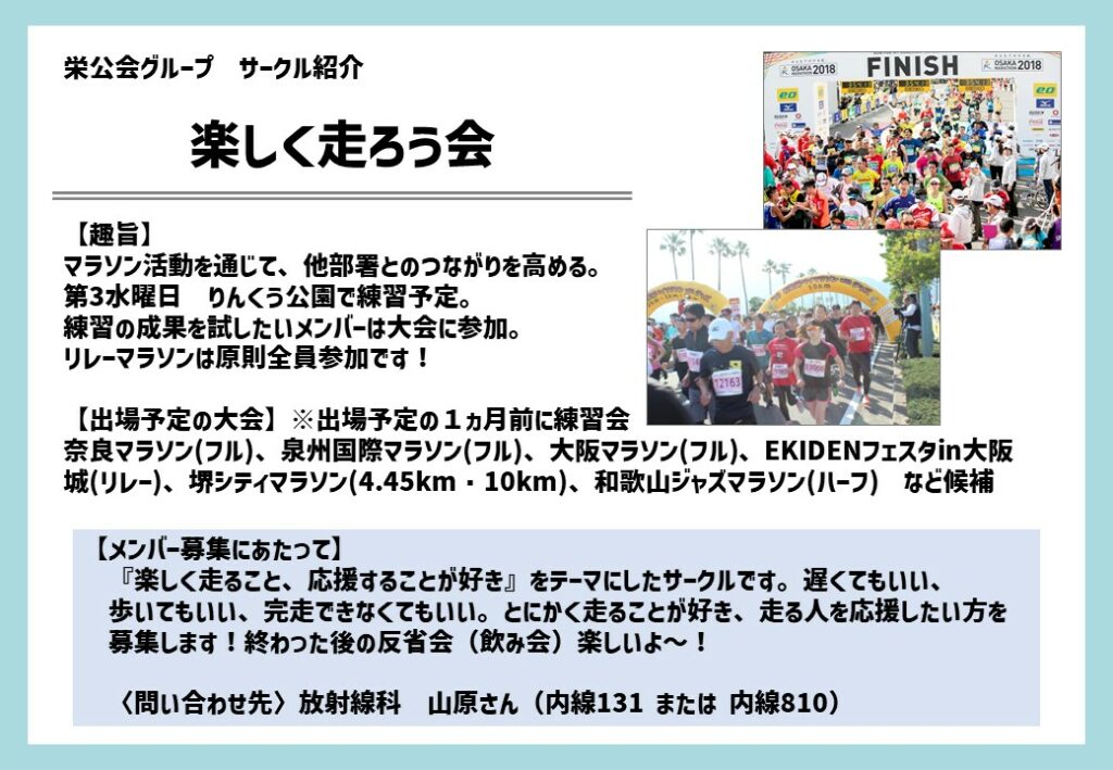 2月の業務後にサークルメンバーでランニング会を3日間行いました。ちょうど気温が下がる日となり、とても寒い中のトレーニングでしたが、走っている間に少しずつ温かくなり、良い運動になりました!また、12/8(日)に奈良マラソンに1名、2/9(日)にはKIX泉州国際マラソンに1名参加し、それぞれ良いタイムで走ることができました