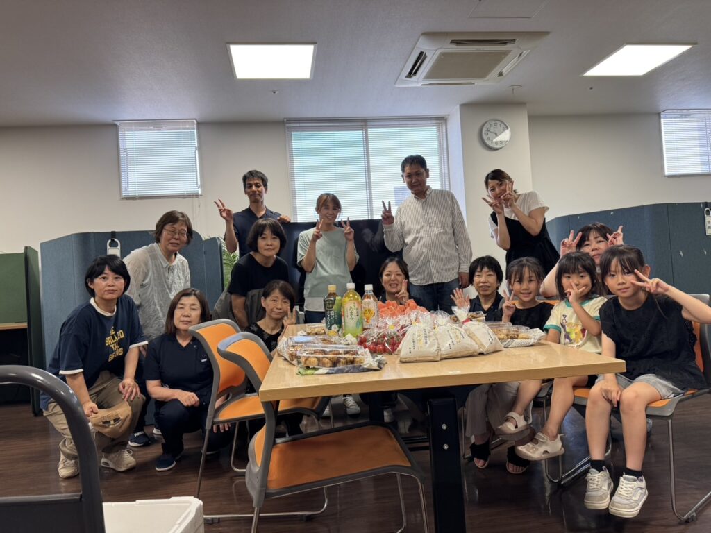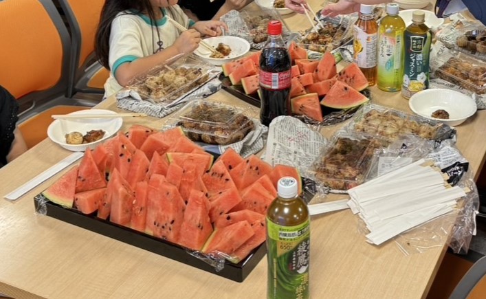 NHKの「鶴瓶の家族に乾杯」の放送で有名になった「たこ焼き下方」さんのたこ焼きとお好み焼き、そして泉佐野市の農家さんの水ナスの漬け物やトマトとスイカを取り寄せ、みんなで楽しみながら美味しく頂きました。