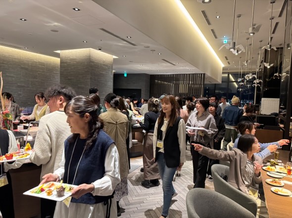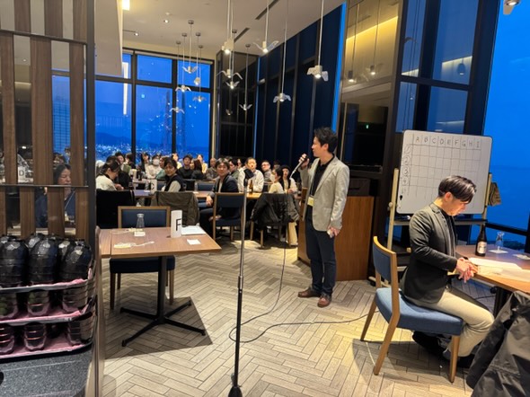 カジュアルなレストランで、先輩スタッフと新入職員の皆さん約100名で、お酒や料理、ゲームを楽しみました。
