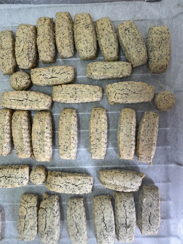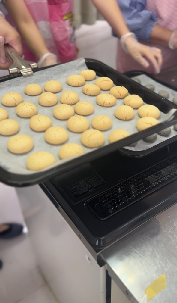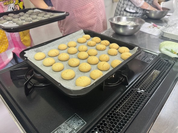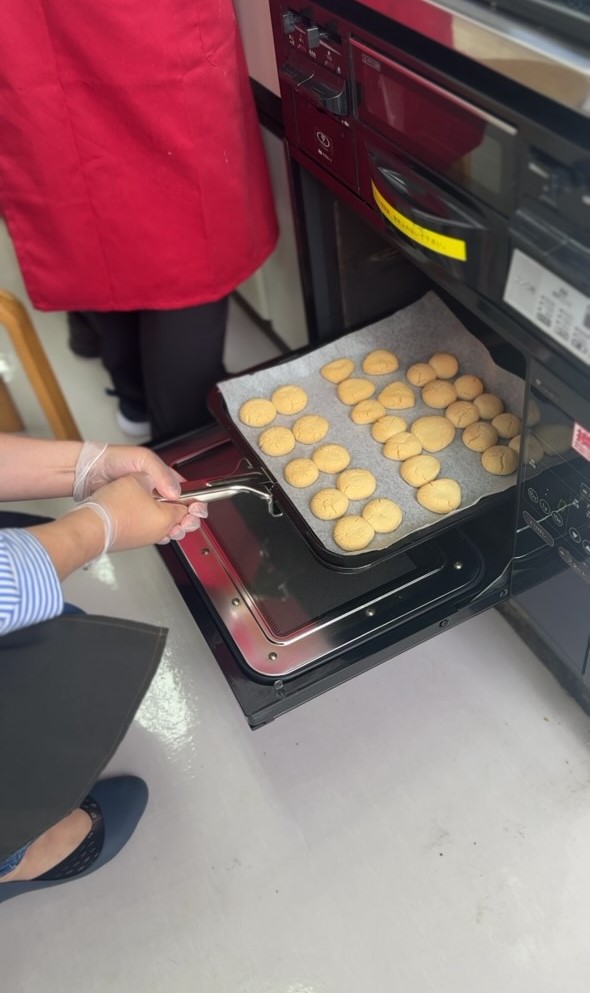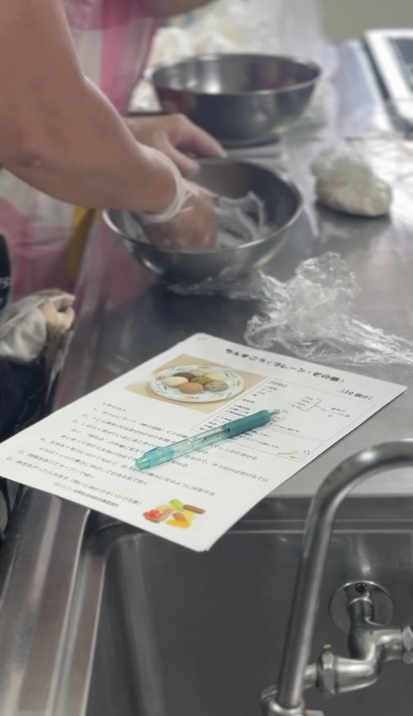 今回は、栄養科のスタッフの方で沖縄出身の方がおられるということで、その方直伝の「ちんすこう」を作りました。クッキーとは違い、でき上がりがほろほろで、みなさんおもいおもいの形に整えてオーブンプレートに並べ、焼き上がりを待っておられました。