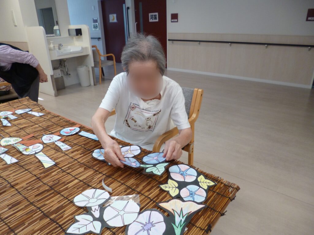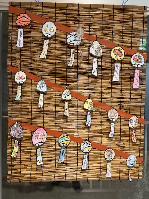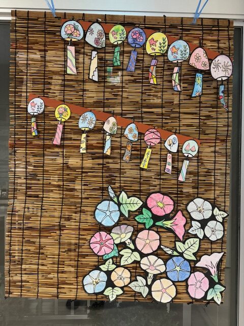 今年度は夏に向け、風鈴や朝顔の絵に色を塗り切り抜いて「すだれ」に貼りました。