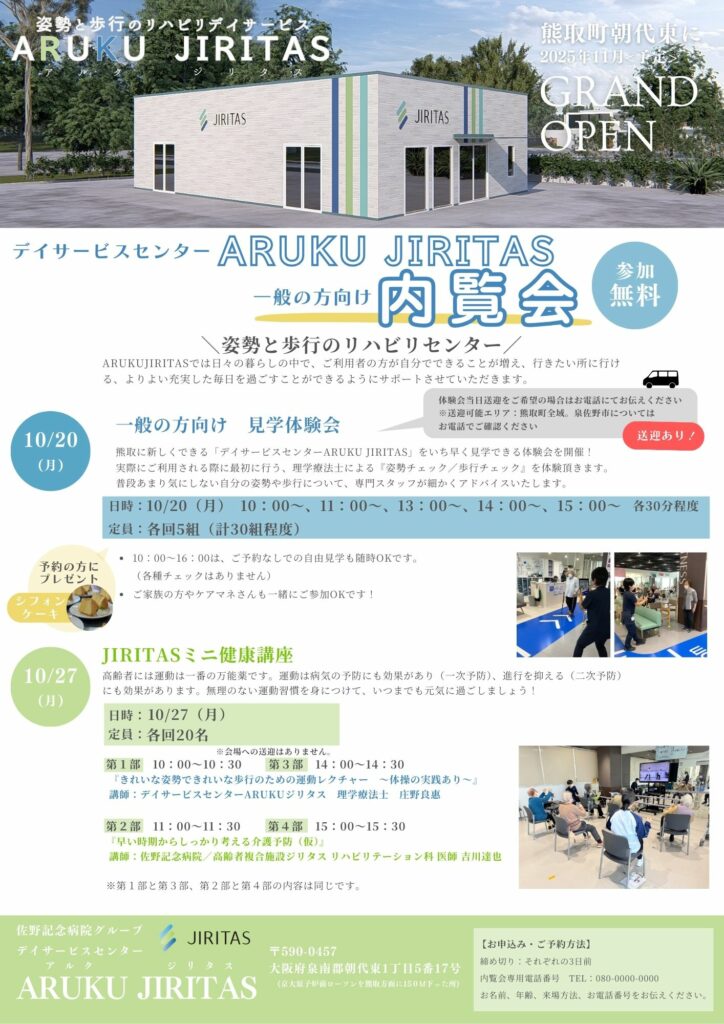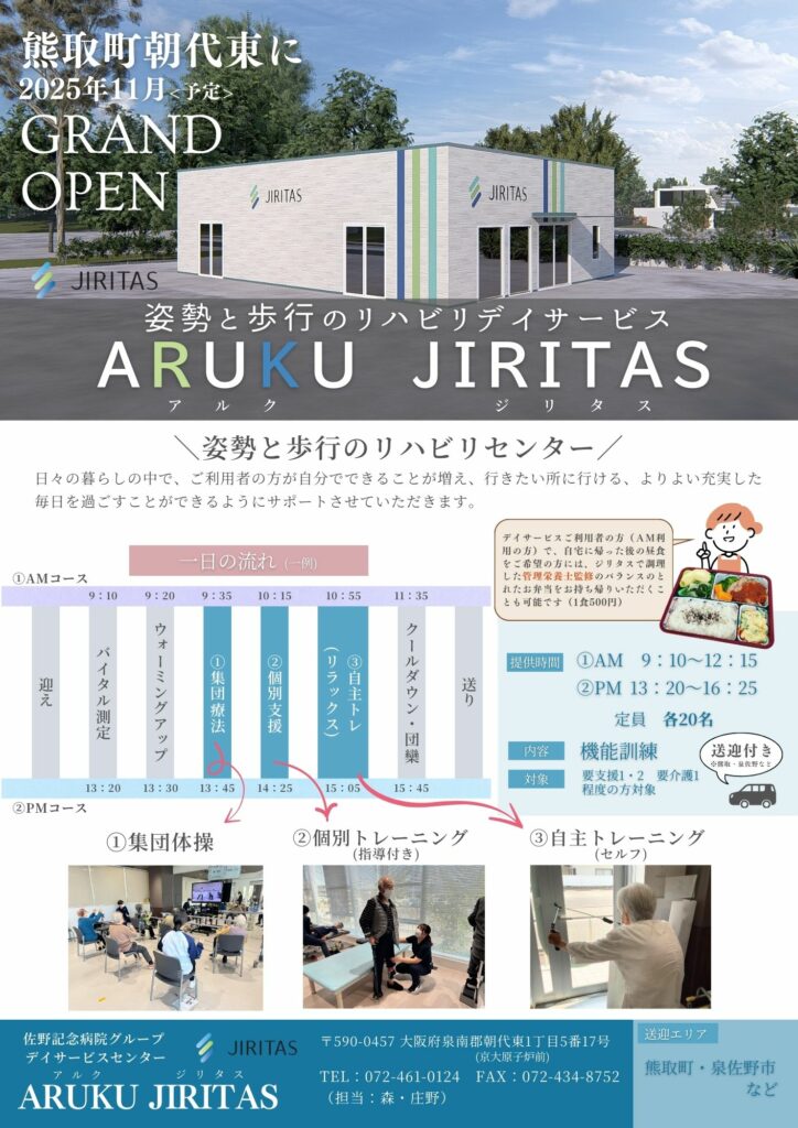 「姿勢と歩行のリハビリデイサービス ARUKU JIRITAS」が熊取町朝代東にオープンします!