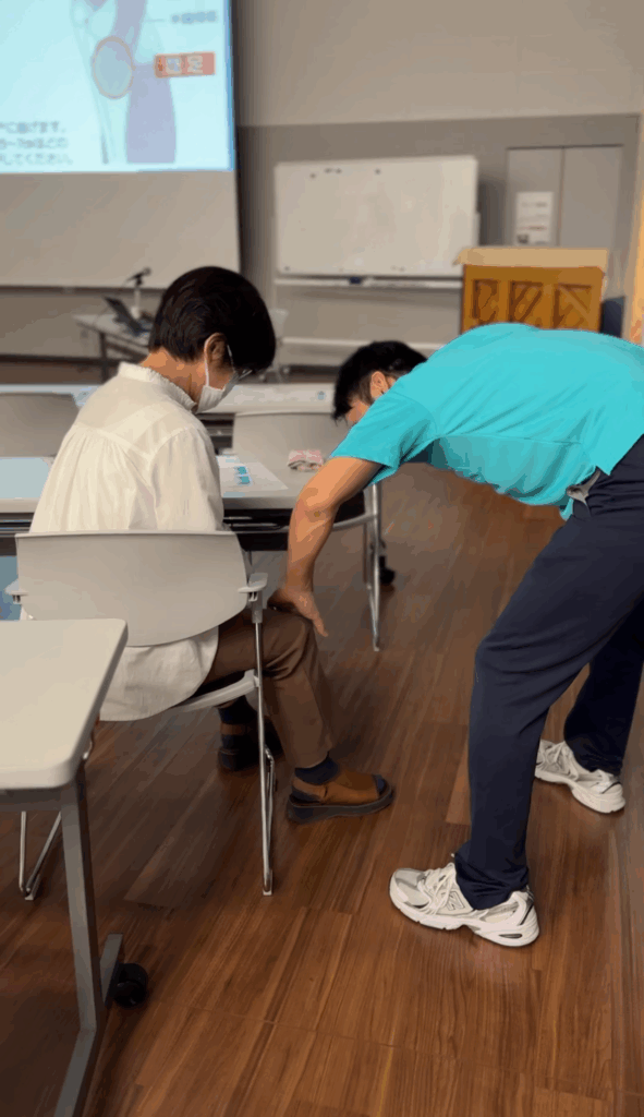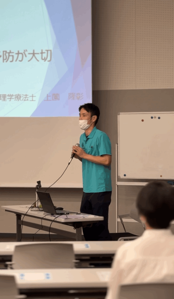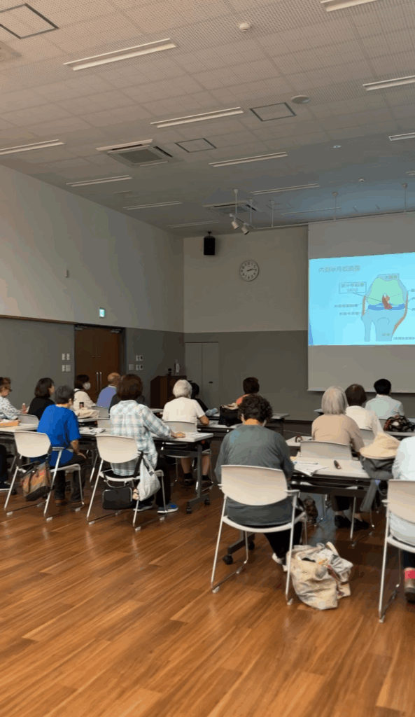 今回はひざの病気について、佐野記念病院理学療法士の上薗PTが講師となり、20名以上の方々に膝の痛みにつながる病気の解説や、家でもできる予防のためのセルフトレーニングをレクチャーしました。