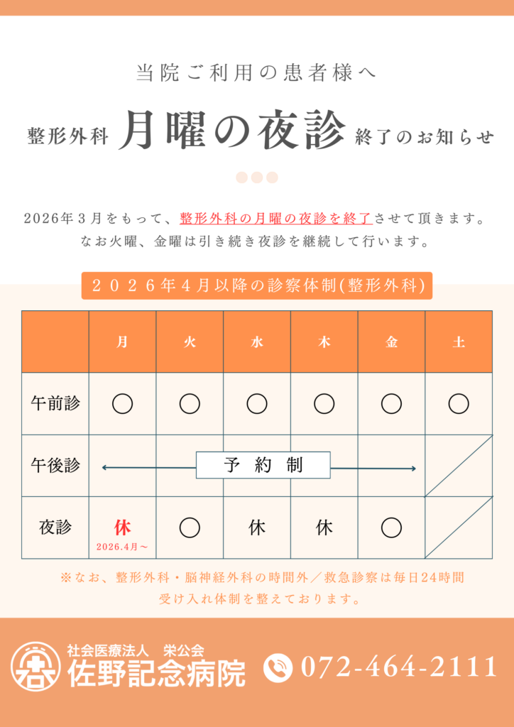 佐野記念病院では2026年3月を持ちまして、整形外科の月曜夜診の診療を終了いたします。