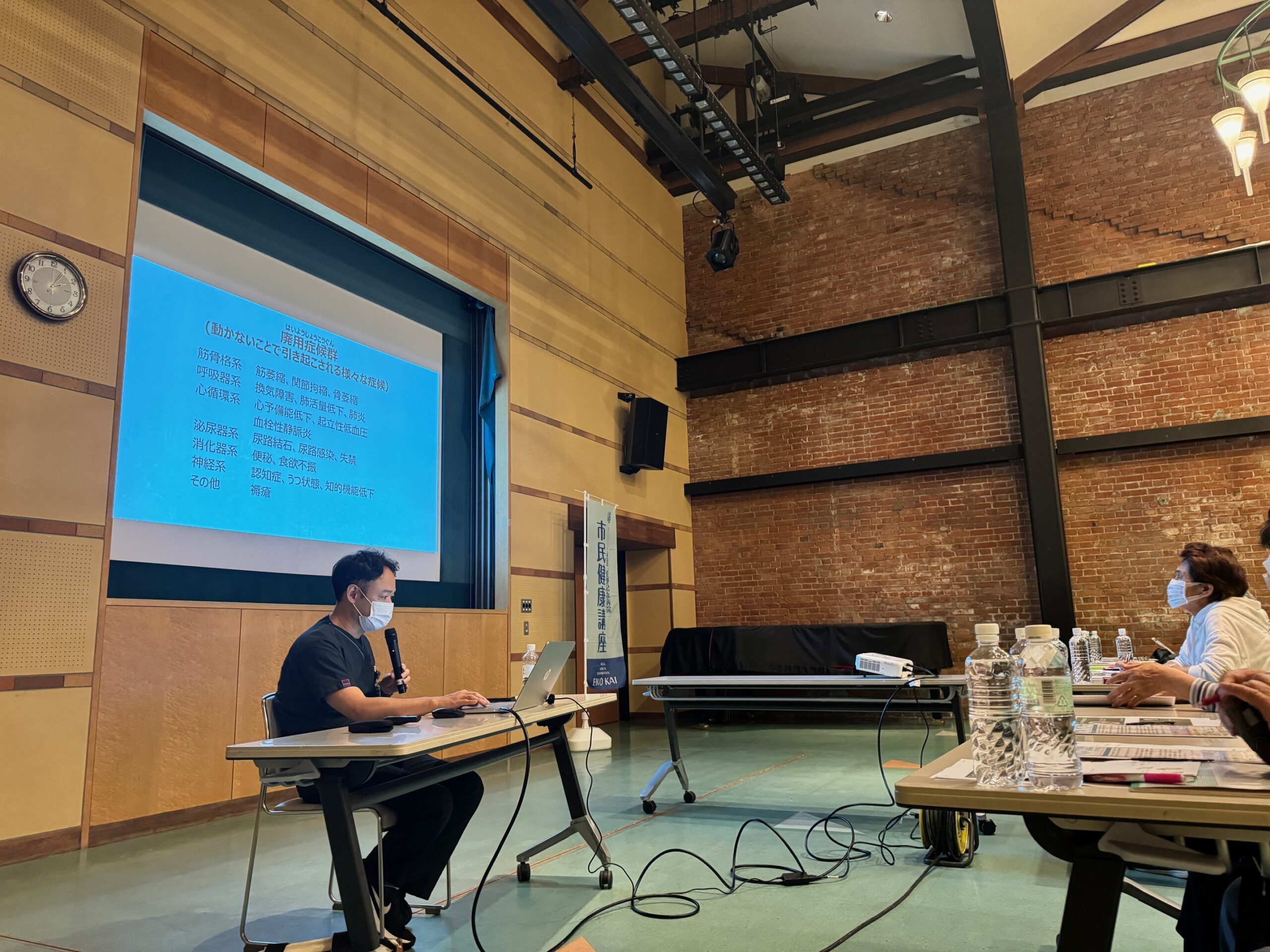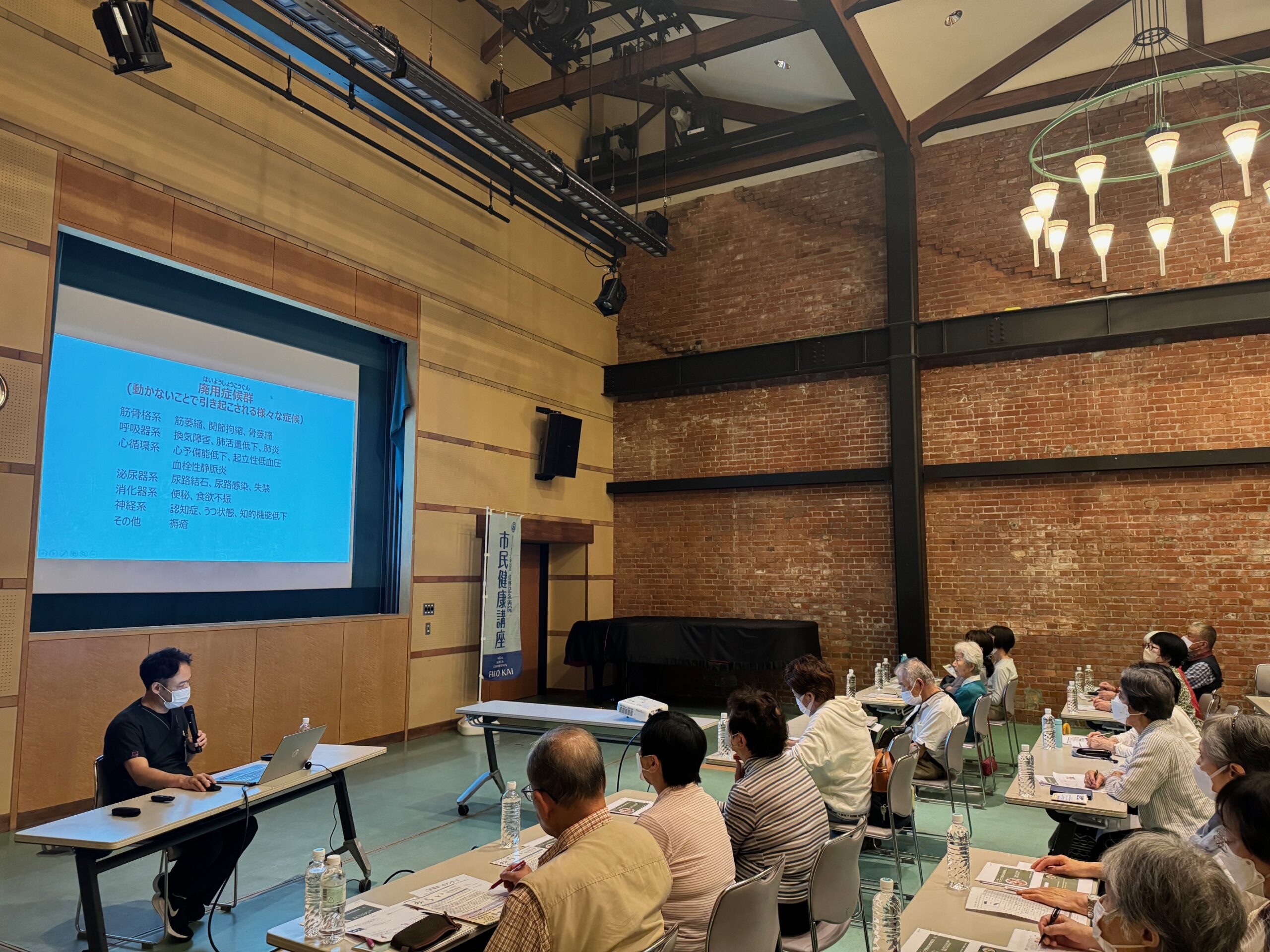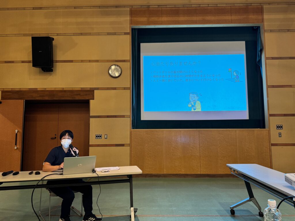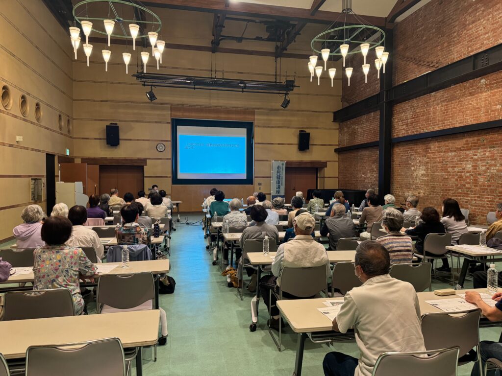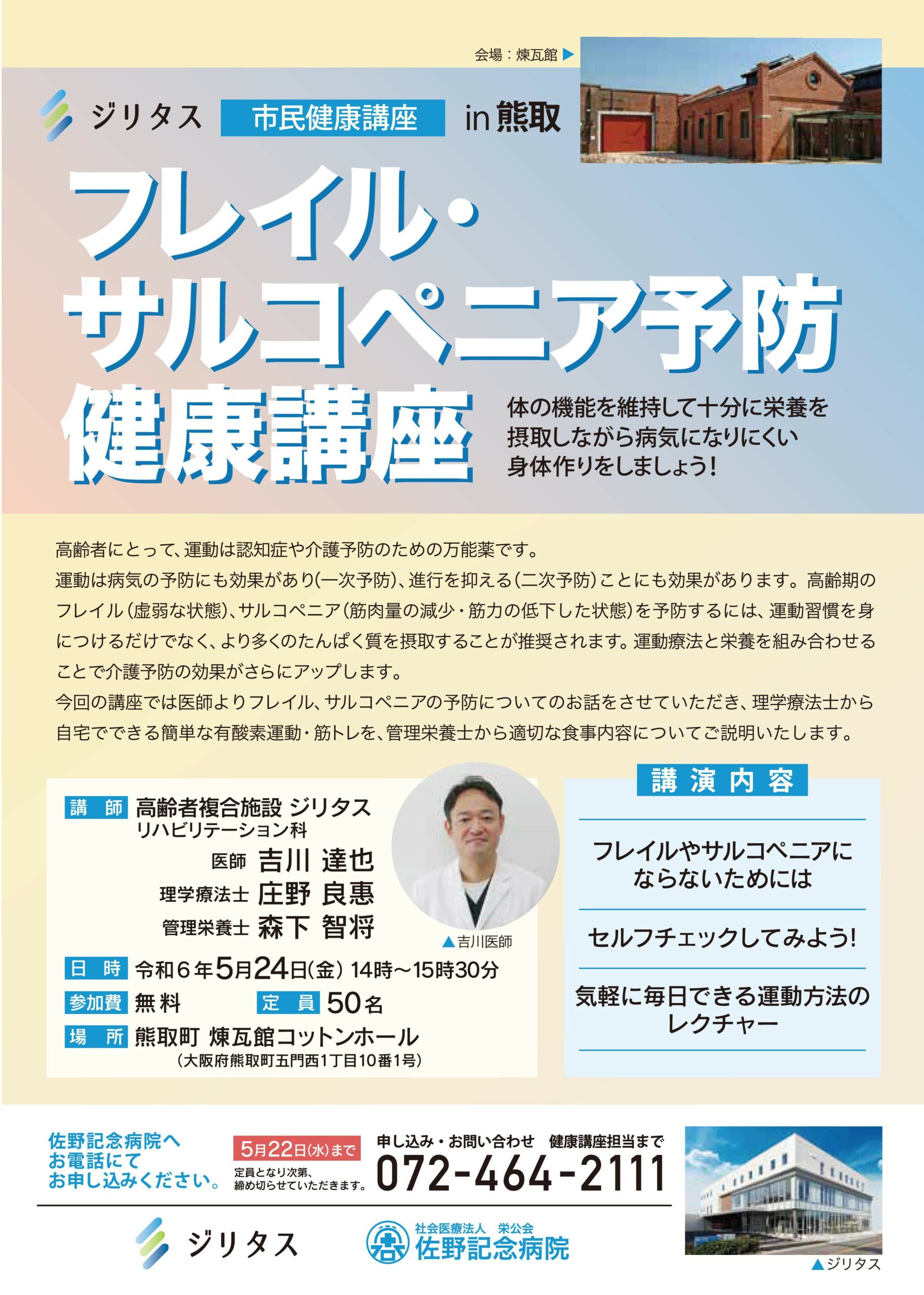 熊取町煉瓦館にて、5月24日(金)にリハビリテーション科・吉川医師、栄公クリニック理学療法士・庄野さん、栄養管理科管理栄養士・森下さんが講師となり、市民健康講座『フレイル・サルコペニア予防』をテーマに健康講座を行いました。