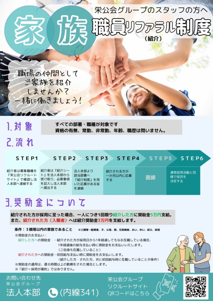 家族職員リファラル(紹介)制度は、当法人で働く職員の家族を積極的に募集することで、当法人の文化や組織風土・業務内容等を効果的かつ正確に応募者に伝え、またつながり意識をもって職員が育成され意欲的に働く人材が充実することを目的に導入いたします。