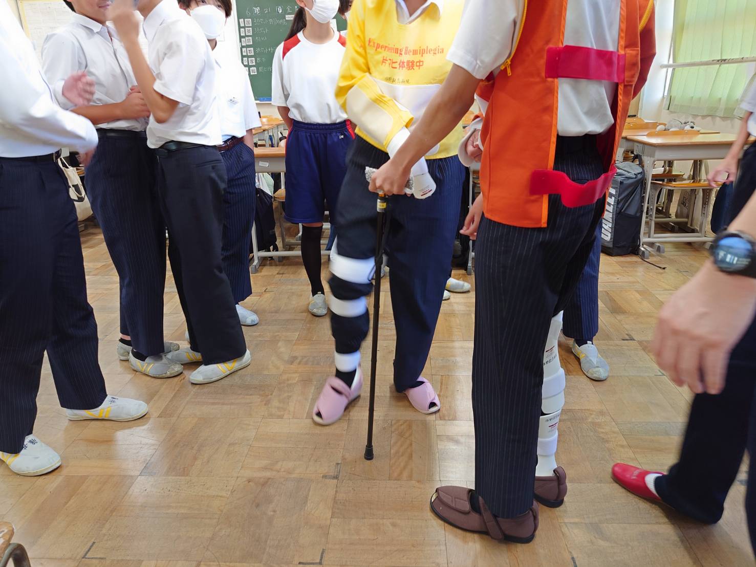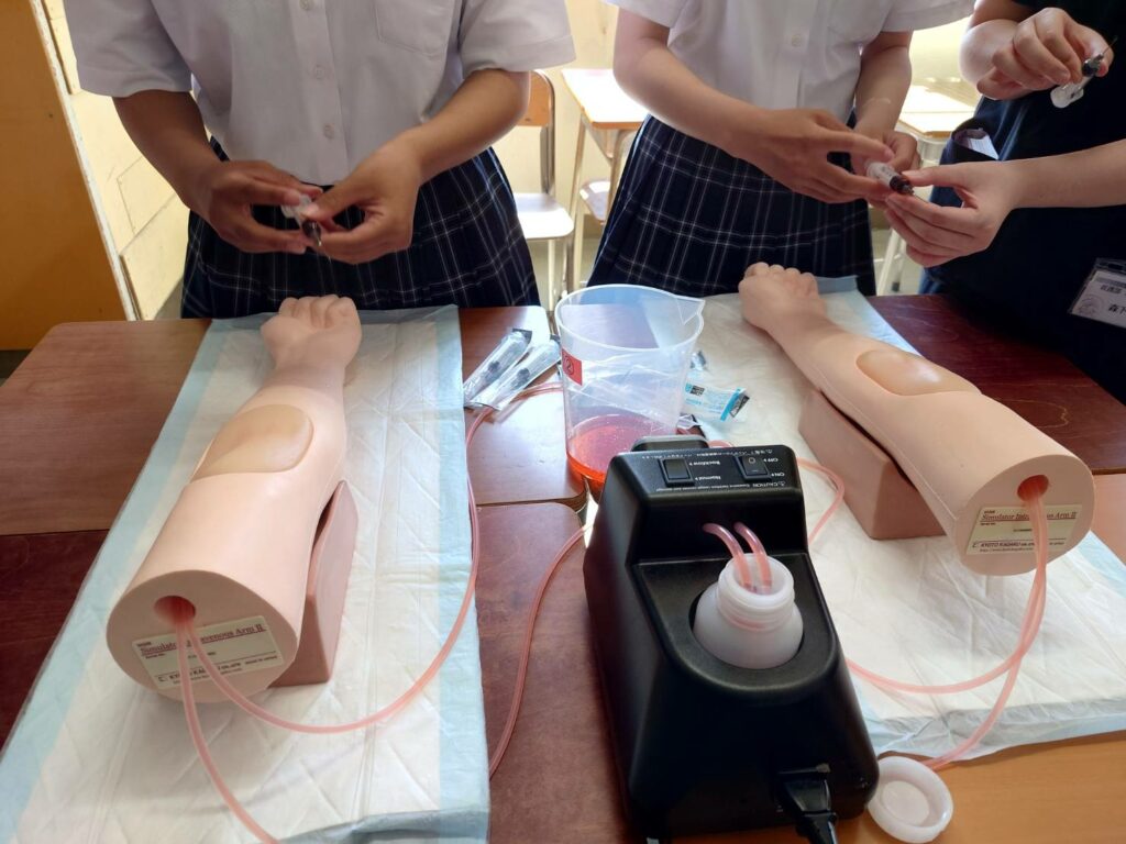 看護師体験として採血体験と血圧の測定を、リハ体験として片麻痺スーツを着てもらって患者体験をしていただきました。