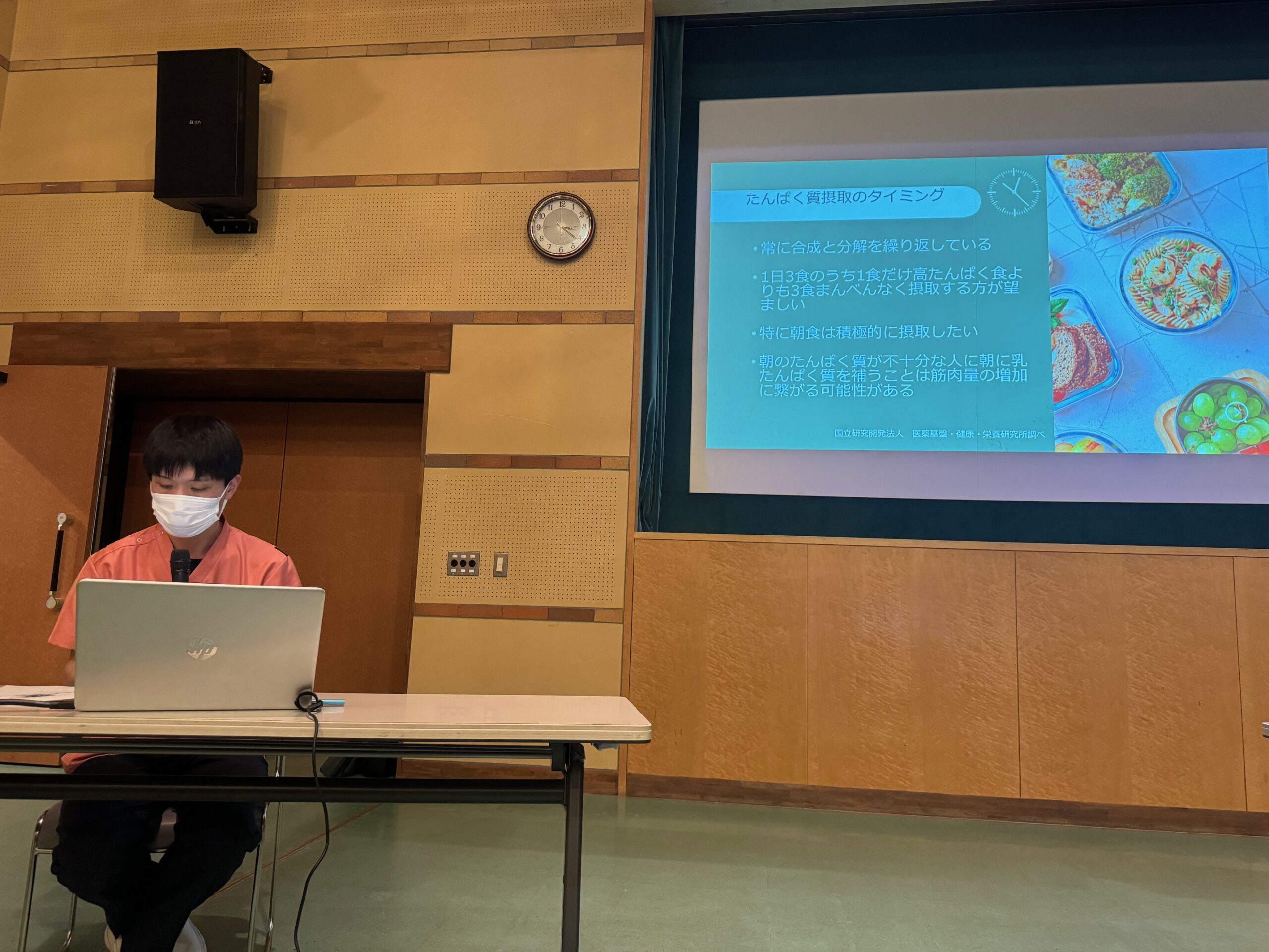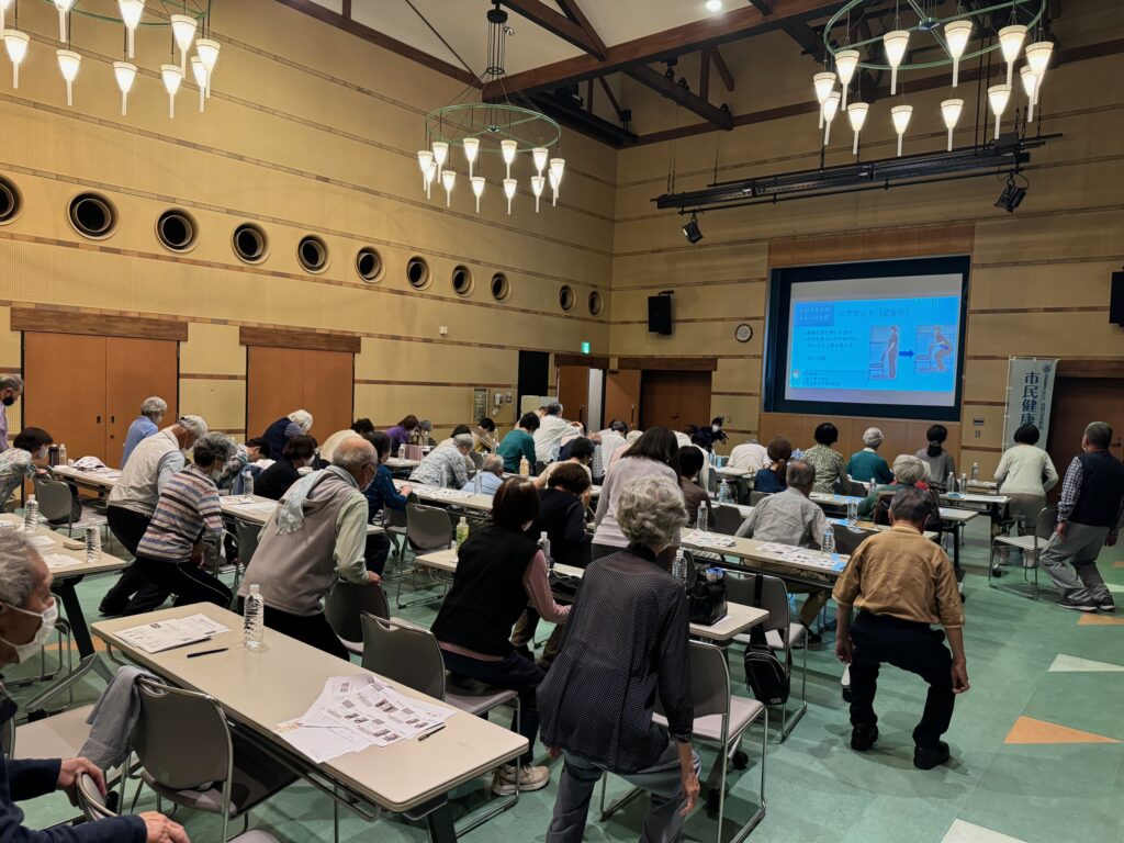 今回は、熊取町にお住まいの方を中心に50名の方が参加されました。吉川先生からは介護予防やフレイル予防には特に運動が大切であることや家の外に出るきっかけを持つことの大切さのお話、庄野さんからはご自宅でできる運動やストレッチについて、森下さんからはタンパク質を中心とした栄養のお話をしていただきました。