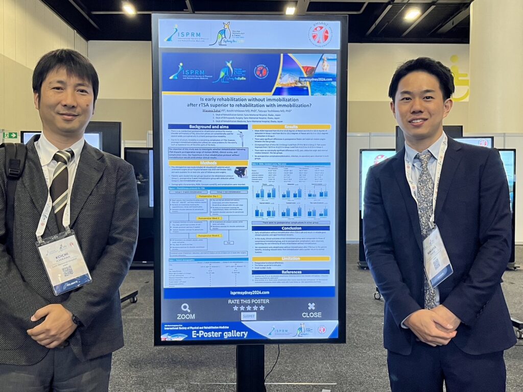 6月1日~6日にオーストラリア・シドニーで開催されたISPRM 2024(International Society of Physical and Rehabilitation Medicine)に、当院整形外科・肩関節チームの坂井雅哉PTと市川耕一医師が参加し、坂井PTが『Is early rehabilitation without immobilization after rTSA superior to rehabilitation with immobilization?』をテーマに発表を行いました。