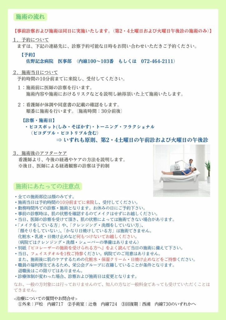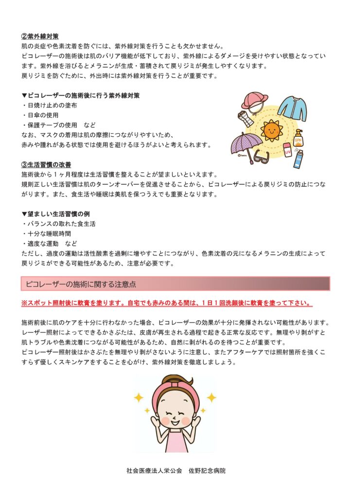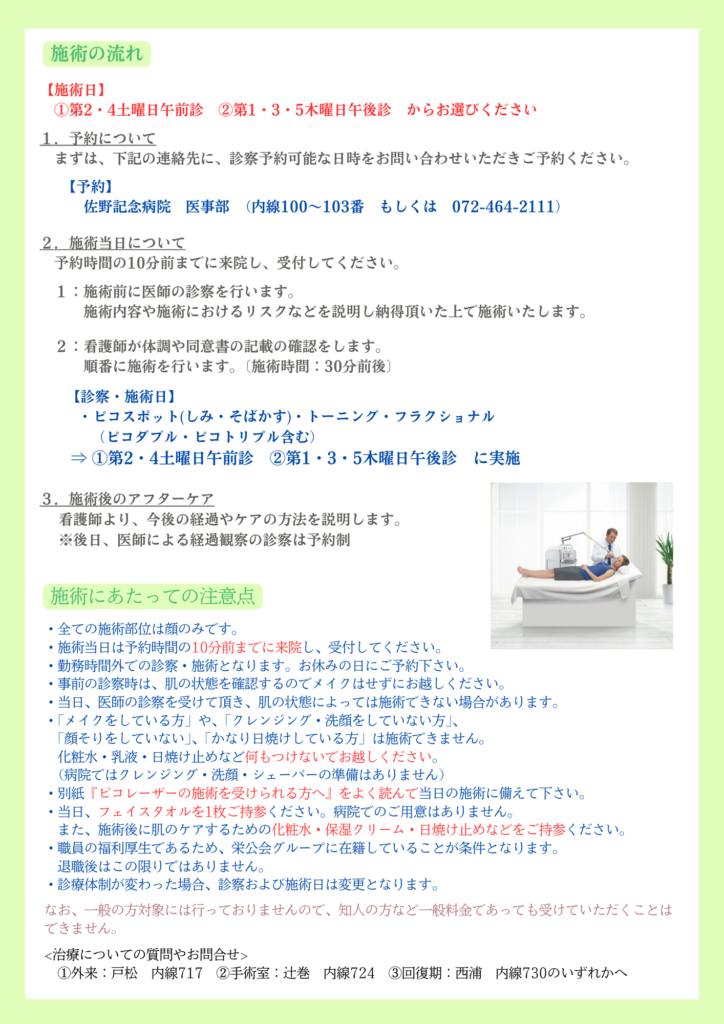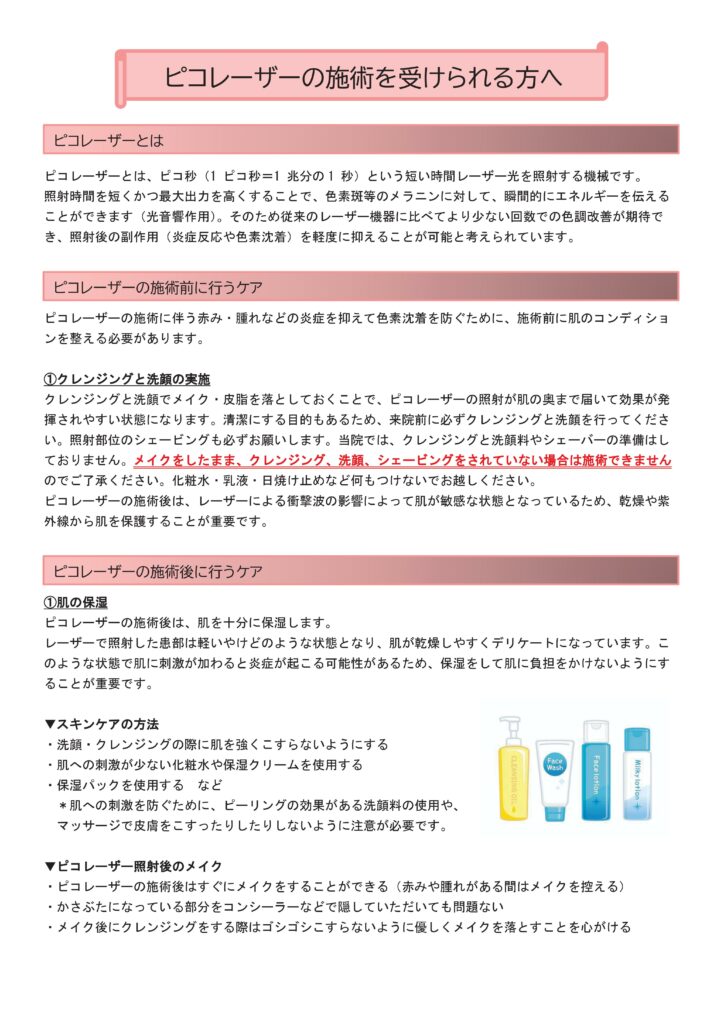 ・別紙『ピコレーザーの施術を受けられる方へ』をよく読んで当日の施術に備えて下さい。