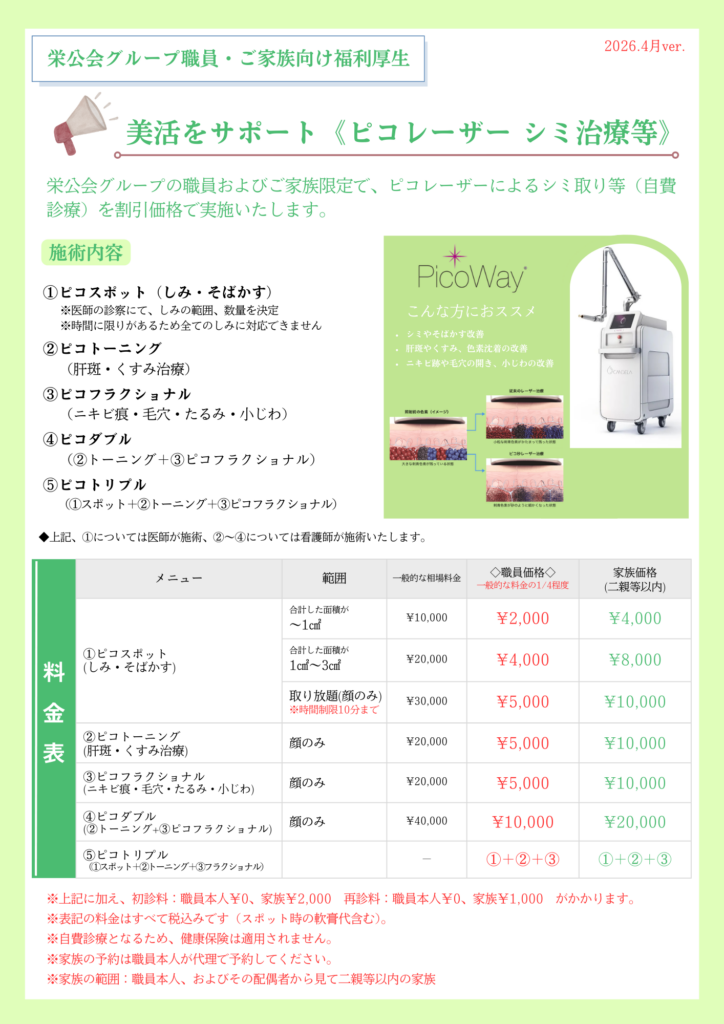 栄公会グループの職員およびご家族限定で、ピコレーザーによるシミ取り等(自費診療)を割引価格で実施いたします。